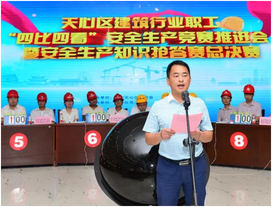 8月18日上午,由天心區(qū)總工會、區(qū)城鄉(xiāng)建設(shè)局聯(lián)合舉辦的天心區(qū)建筑行業(yè)職工“四比四看”安全生產(chǎn)競賽推進會暨安全生產(chǎn)知識搶答賽總決賽在區(qū)機關(guān)3樓大會議室隆重舉行,天心區(qū)建設(shè)局黨組書記、局長李勁松任主持,市總工會、市城鄉(xiāng)建設(shè)局相關(guān)領(lǐng)導、區(qū)政府副區(qū)長洪孟春、區(qū)總工會、區(qū)建設(shè)